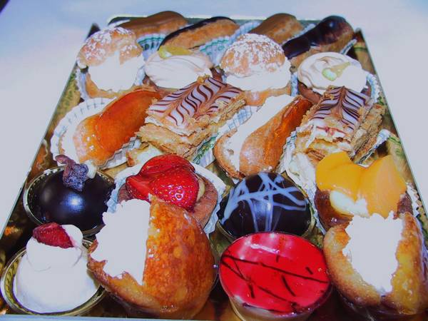 Assortiments d’éclairs café, chocolat et chantilly, de mille-feuilles, de tartelettes fruits et citron, de baba au rhum, de mousses aux fruits et au chocolat. En plateau de 12,18,20,25,30 ou 40 pièces.